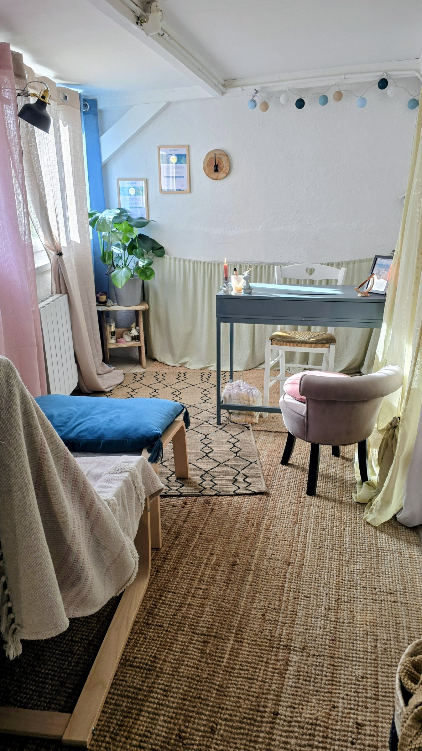 Un espace pensé pour le calme et la reconnexion à soi : lumière douce, matières naturelles, atmosphère chaleureuse. Ici, on prend le temps d’atterrir, d’écouter, de déposer. Chaque séance se déroule dans un cadre respectueux et apaisant, propice au relâchement du corps et de l’esprit.